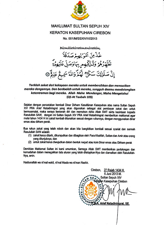 Bertepatan dengan perayaan Isra Mi'raj 1434 H ini, pada hari Jum'at 27 Rajab 1434 H/ 6 Juni 2013, Kanjeng Gusti Sultan Sepuh XIV PRA Arief Natadiningrat kembali memimpin langkah dalam menegakkan Zakat dengan mengeluarkan Maklumat Sultan Sepuh XIV mengenai penarikan dan pembagian zakat menggunakan dinar Dirham. "Zakat harus ditarik dan dibagikan oleh Para Khalifah, Sultan dan Amir atau orang yang ditunjuknya, dan zakat harus diwujudkan dalam nuqud: Dinar dan Dirham", begitu bunyi sepenggal Maklumat Sultan Sepuh XIV.